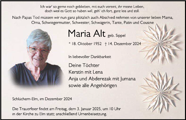 Maria Altgestorben am 14. Dezember 2024